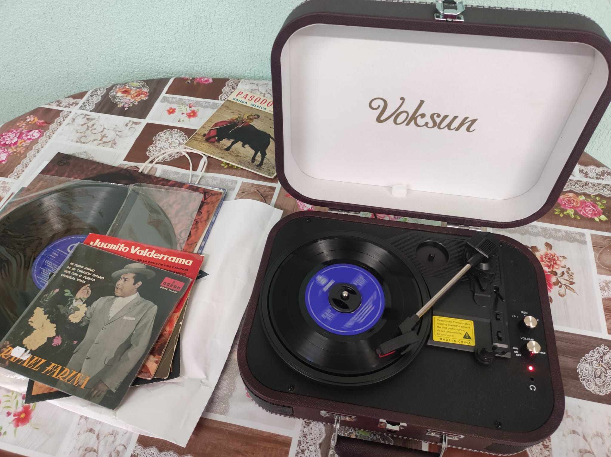 con tocadiscos, singles de 45 revoluciones y LP de 33.